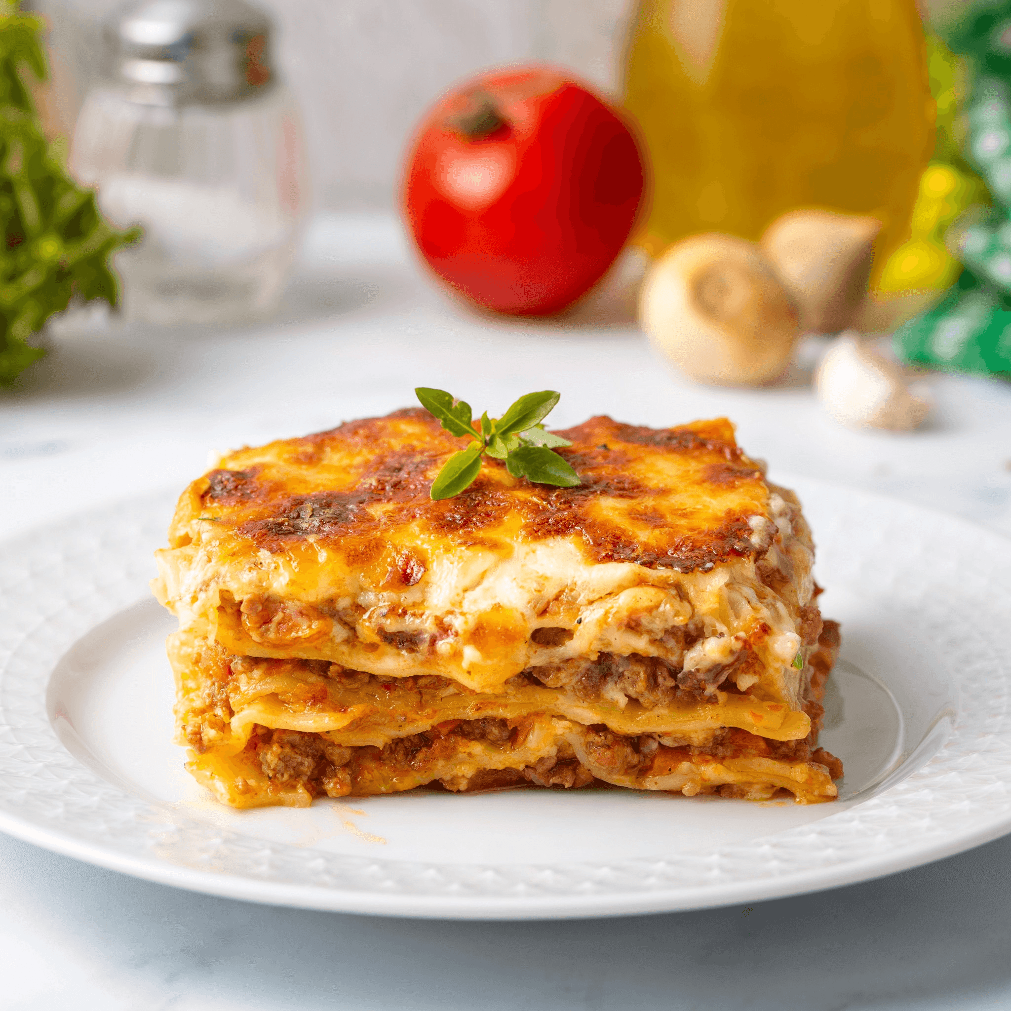 Layered dish with wide flat pasta.