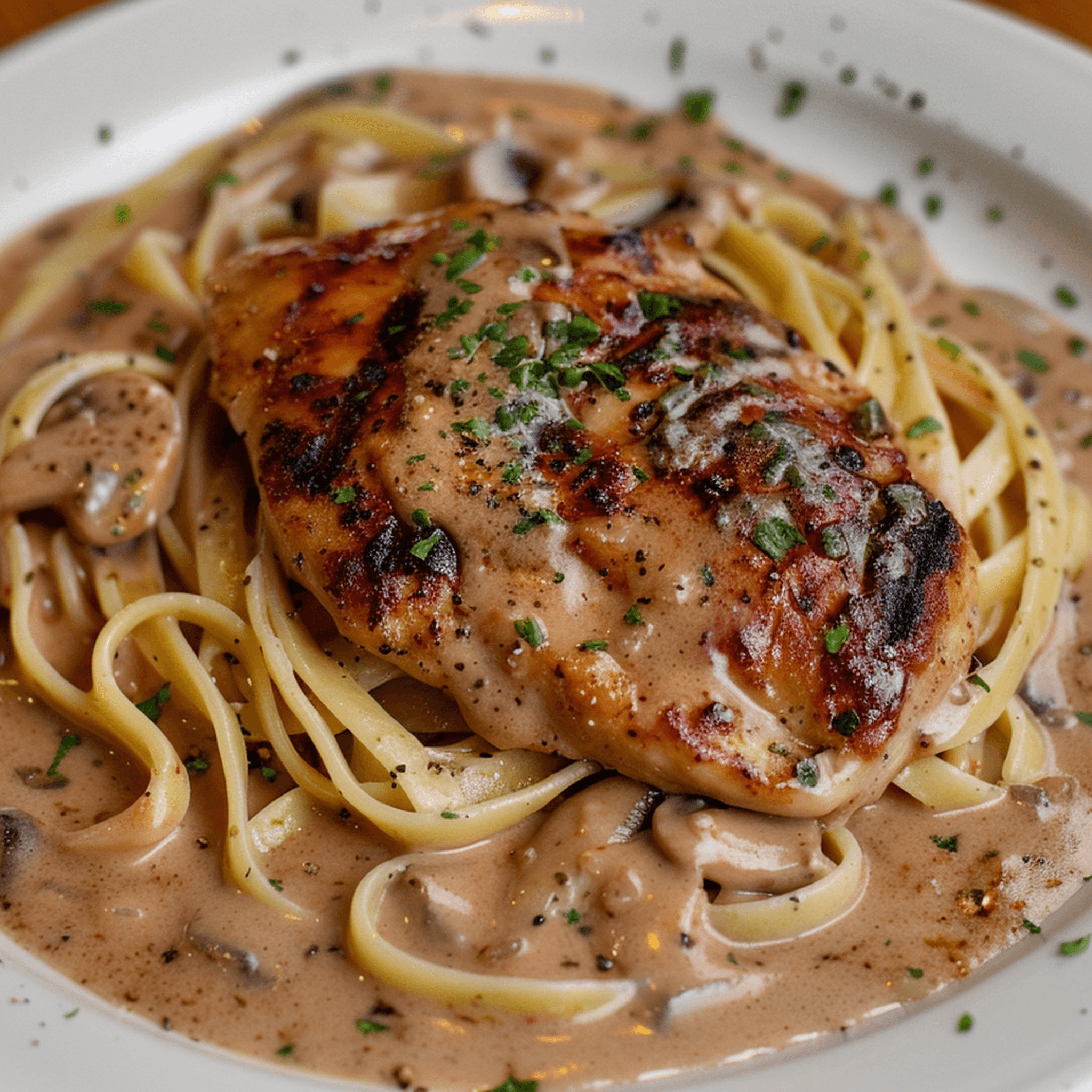 Enjoy a hearty dish of succulent chicken sautéed with lush mushrooms and aromatic marsala wine. Complement your main course with a side of your choice, from a range of flavorful pasta options. All entrées are served with pasta or house salad. Substitute chicken for veal for an additional charge.
