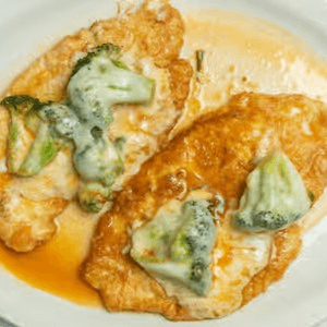 Battered chicken breast topped with broccoli and mozzarella in a cherry plum tomato sauce. All entrées are served with pasta or house salad. Substitute chicken for veal for an additional charge.