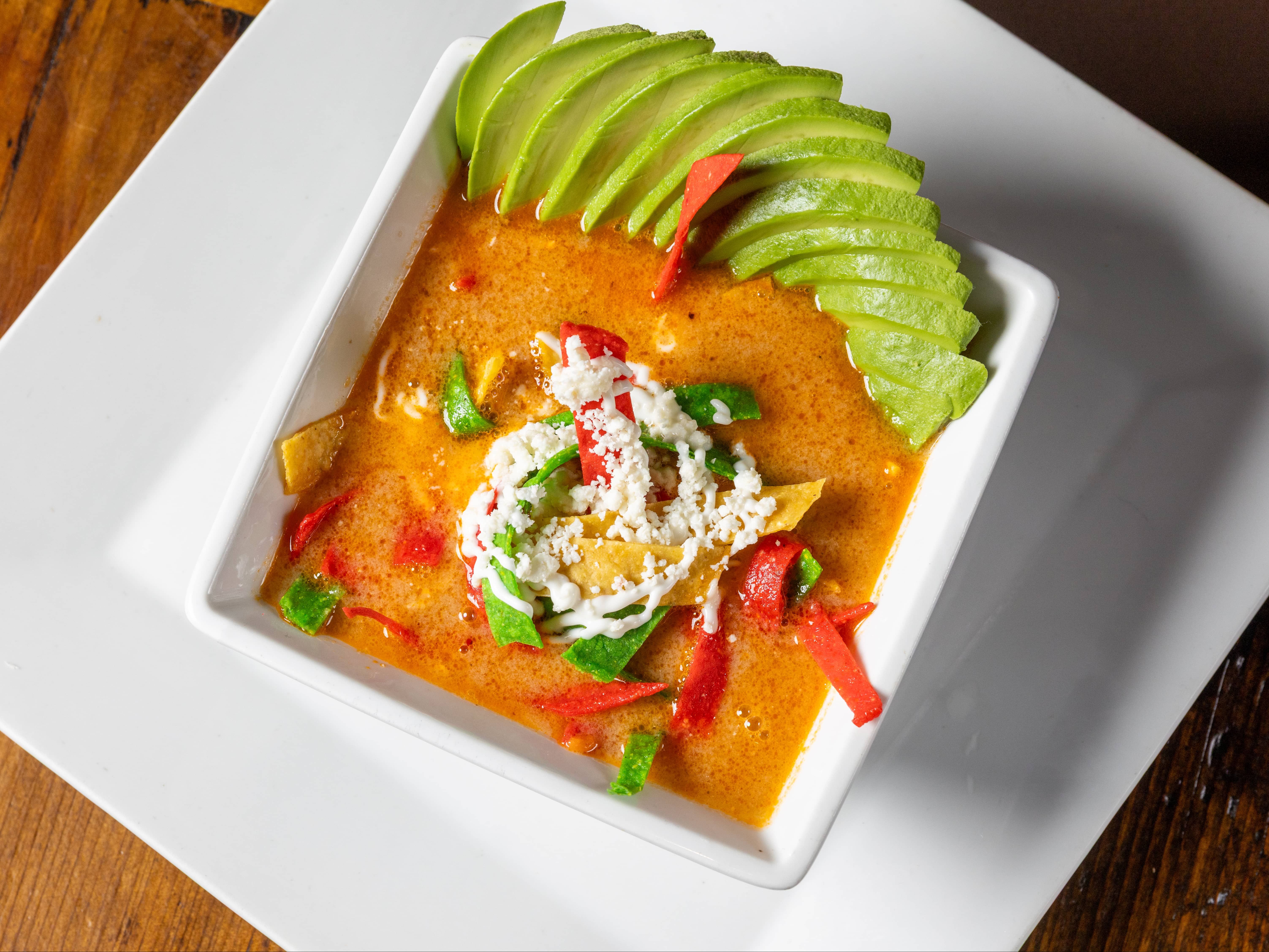 Tortilla chips diced avocados and tomatoes in a chicken broth with guajillo sauce