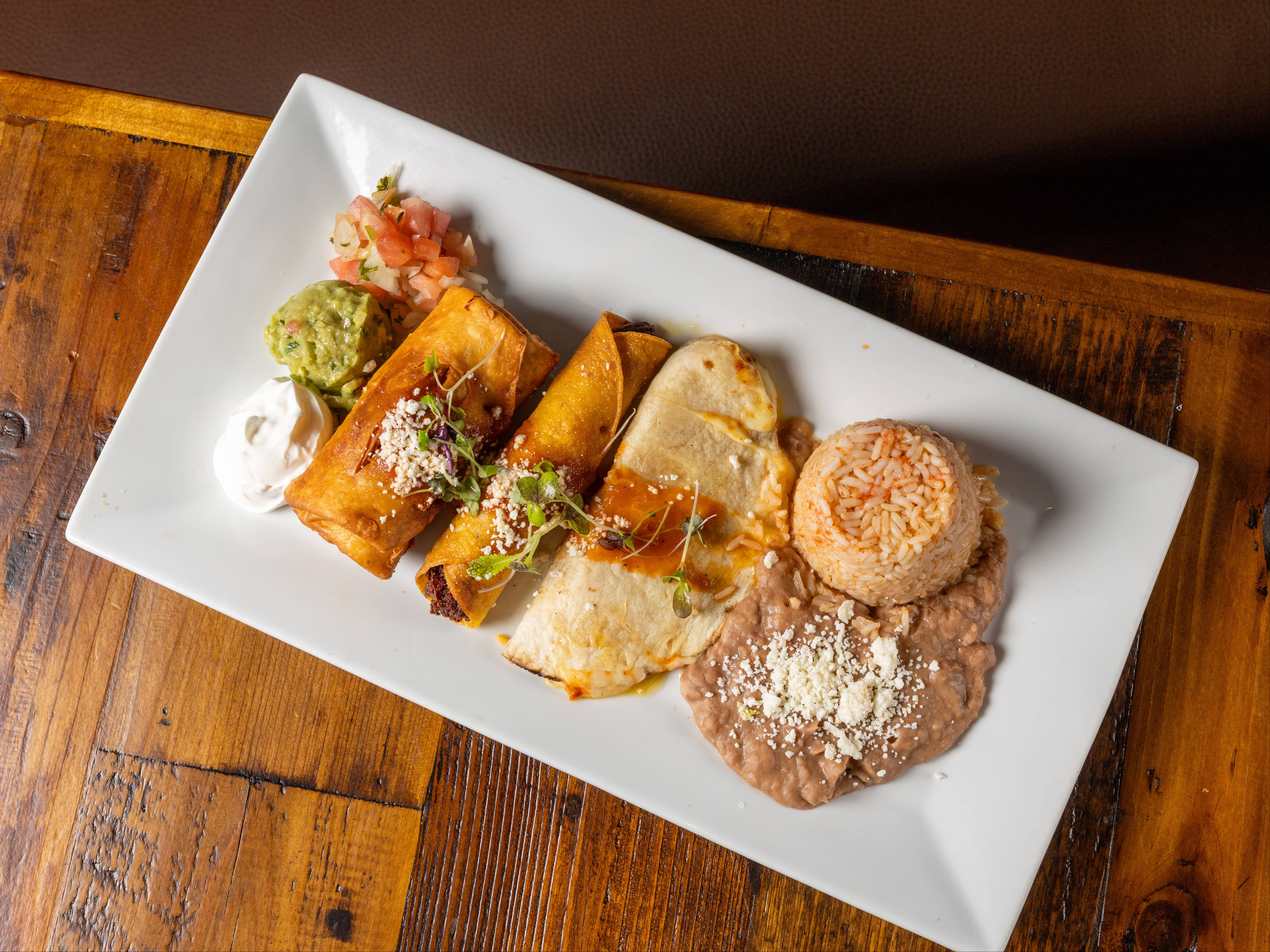 A Delicious combination of a cheese quesadilla, a chicken flauta and a beef chimichanga, served with guacamole, crema and Pico de Gallo.