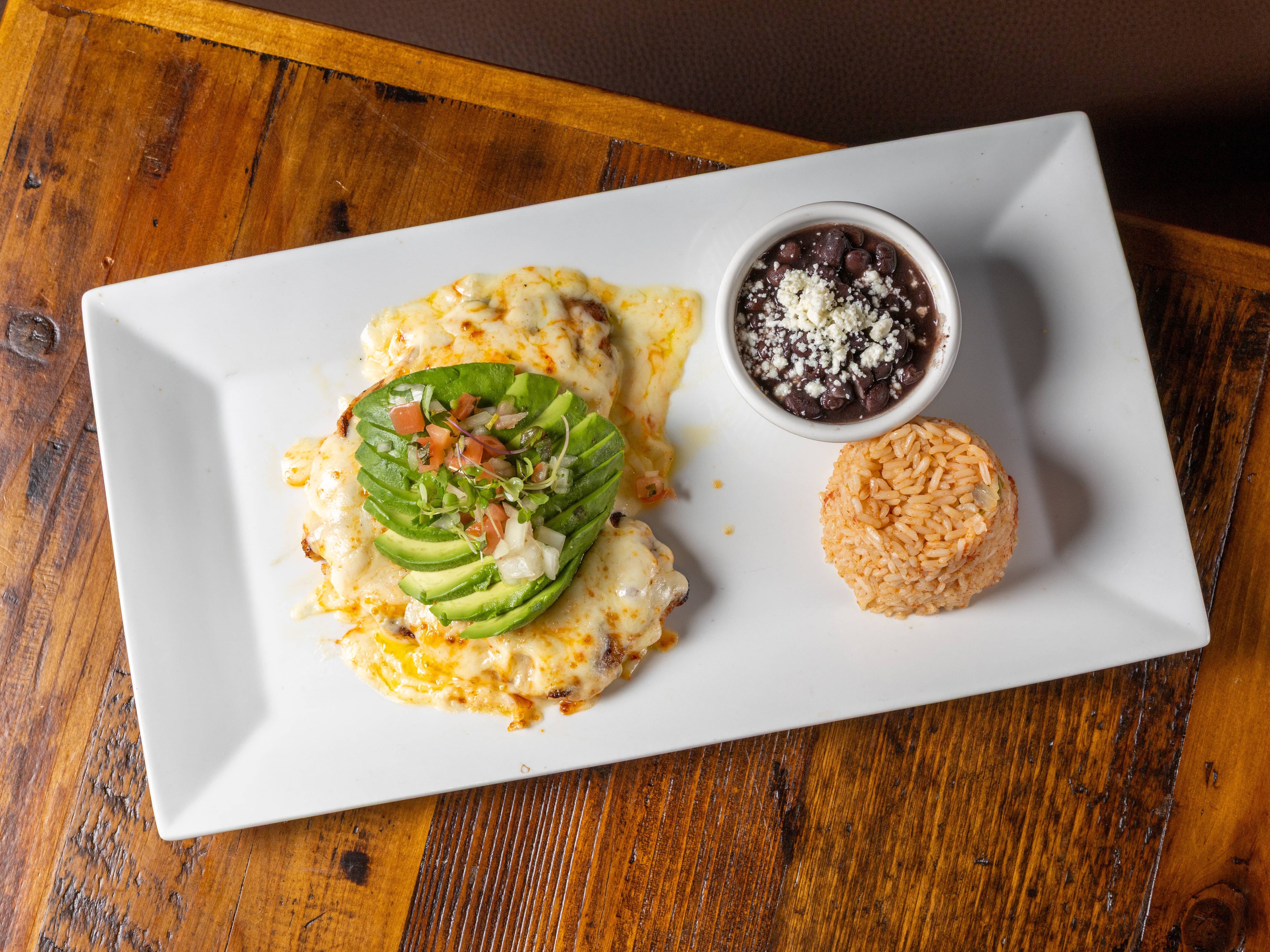 Three rolled soft corn tortilla stuffed with shredded chicken or ground beef, topped with your choice of Guajillo, Mole or Suiza sauce and queso fresco