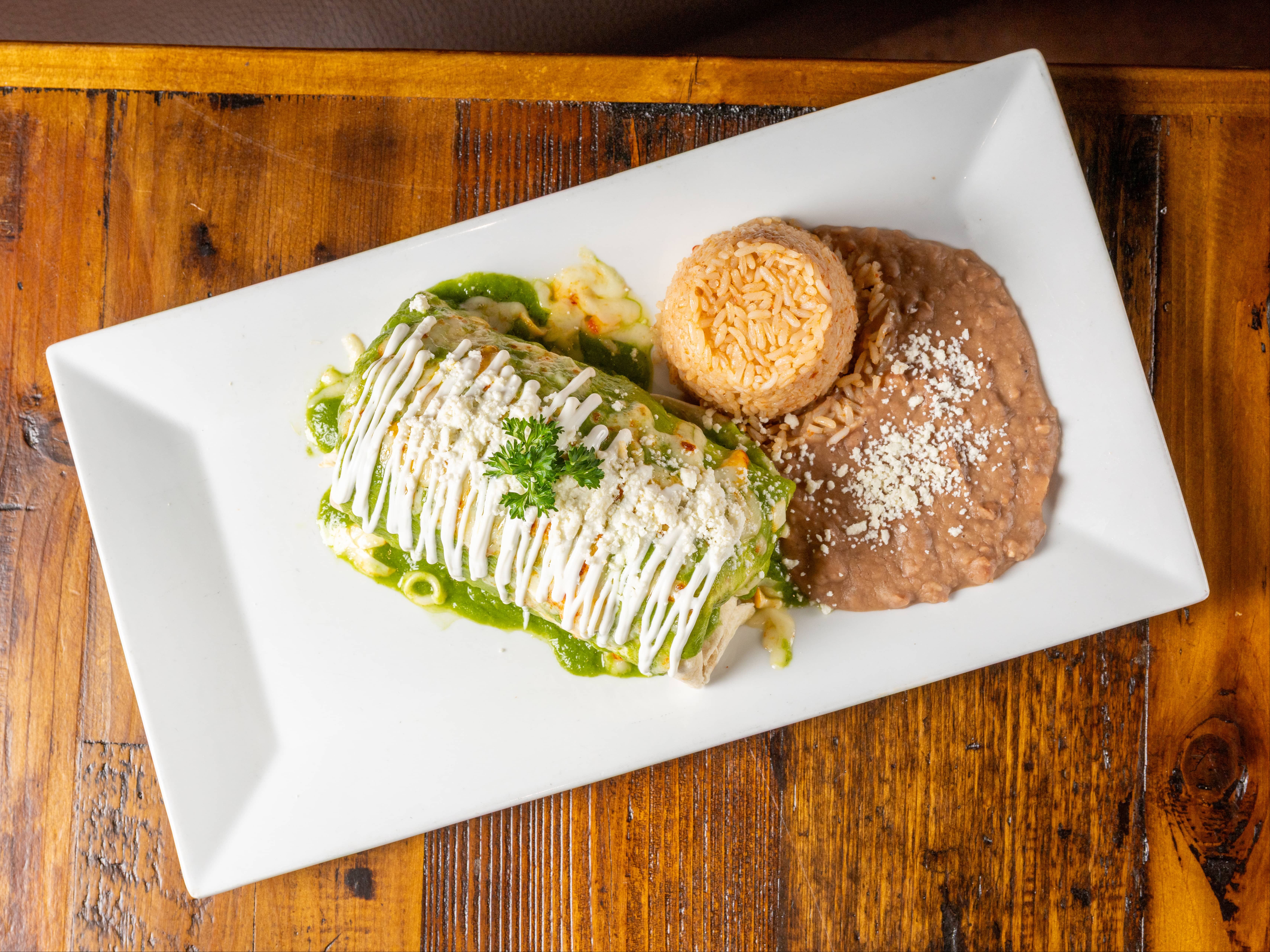 Large flour tortilla, stuffed with your choice of meat, lettuce, guacamole, sour cream, rice and beans, topped with salsa Verde and with 3 quesos.