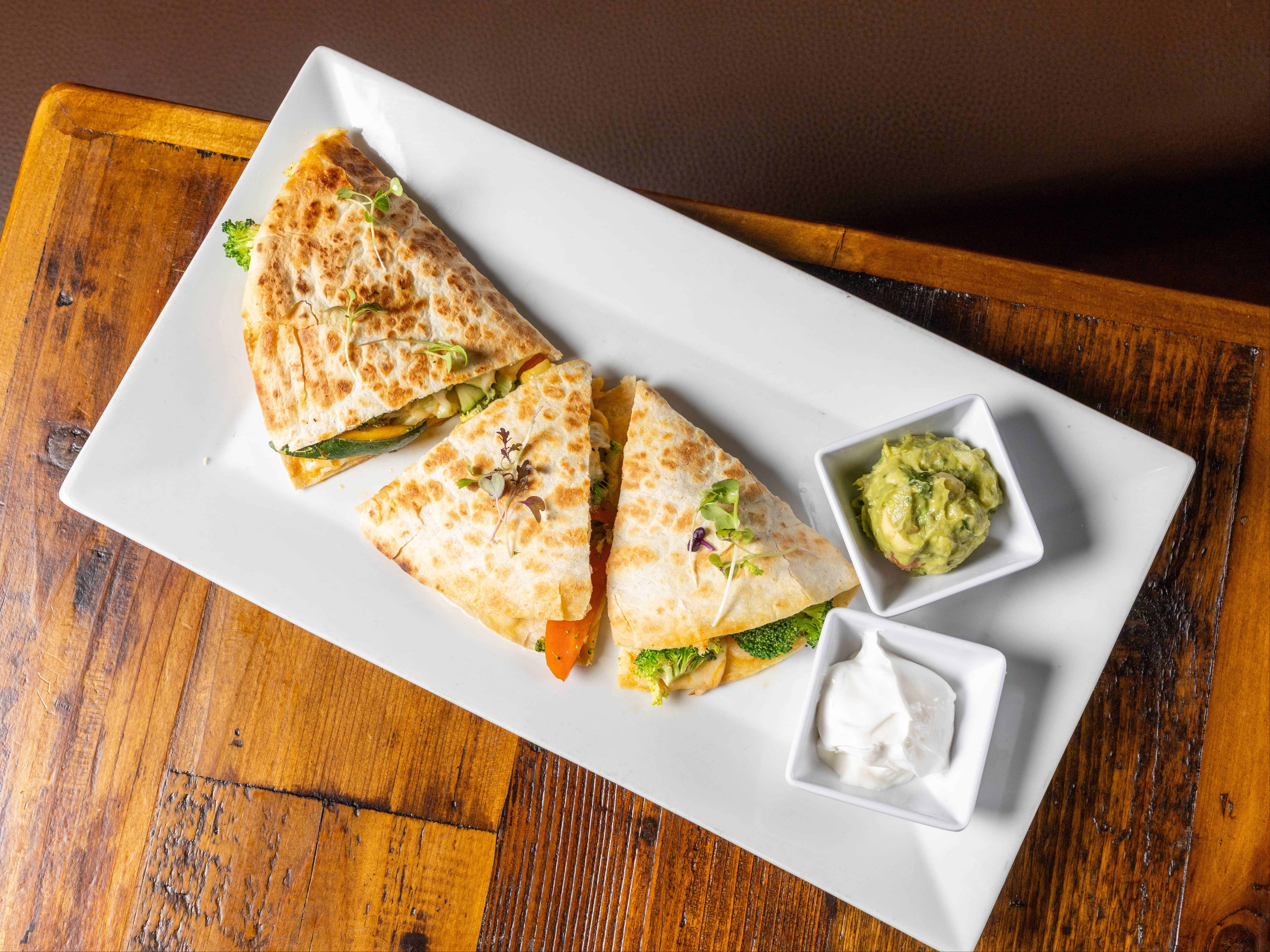 Large 10" flour tortilla stuffed with melted cheese topped with guacamole, crema, and a mild sauce.