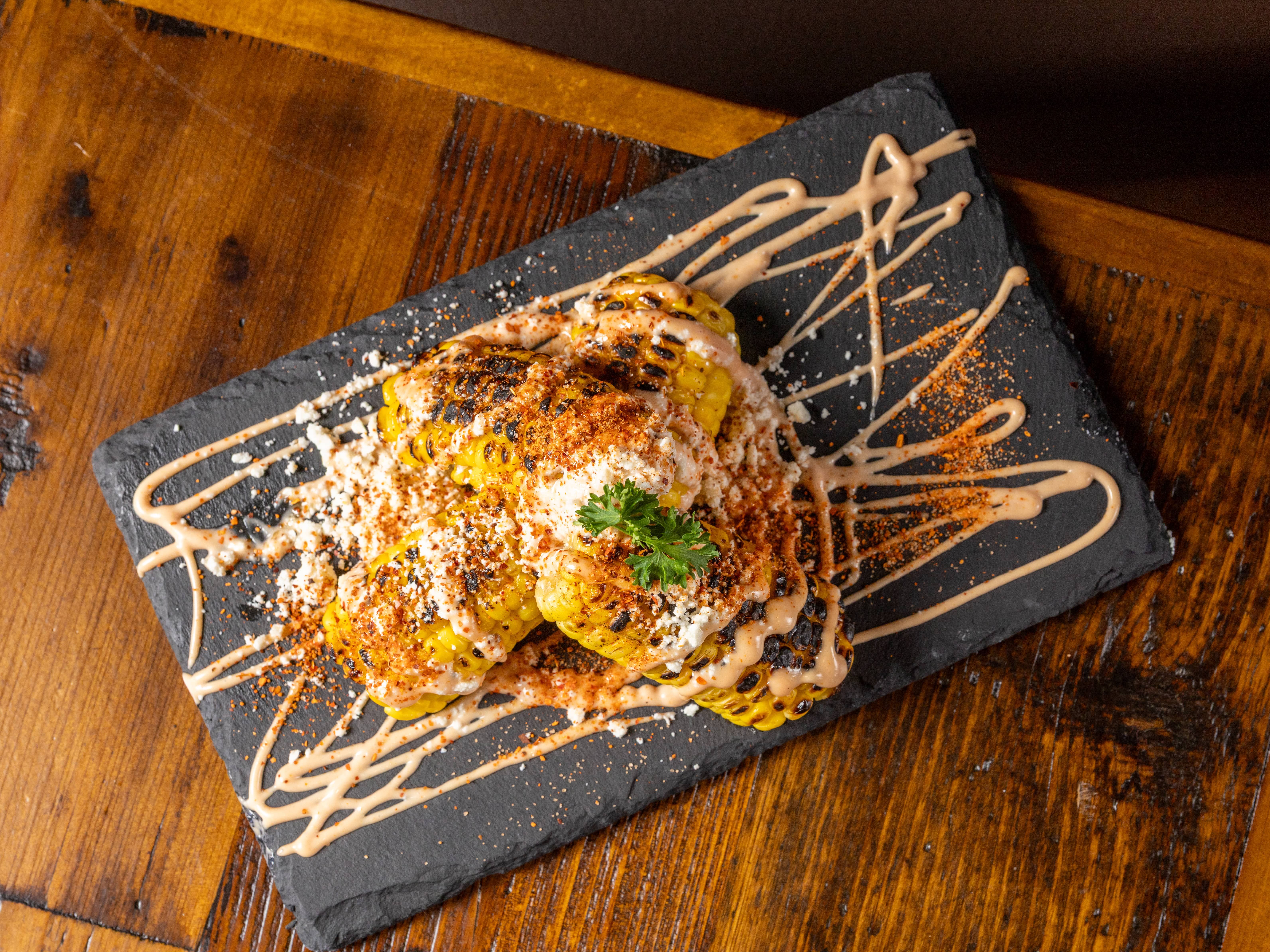 Fire-grilled corn on the cob with creamy sauce, cotija cheese, chili, and lime