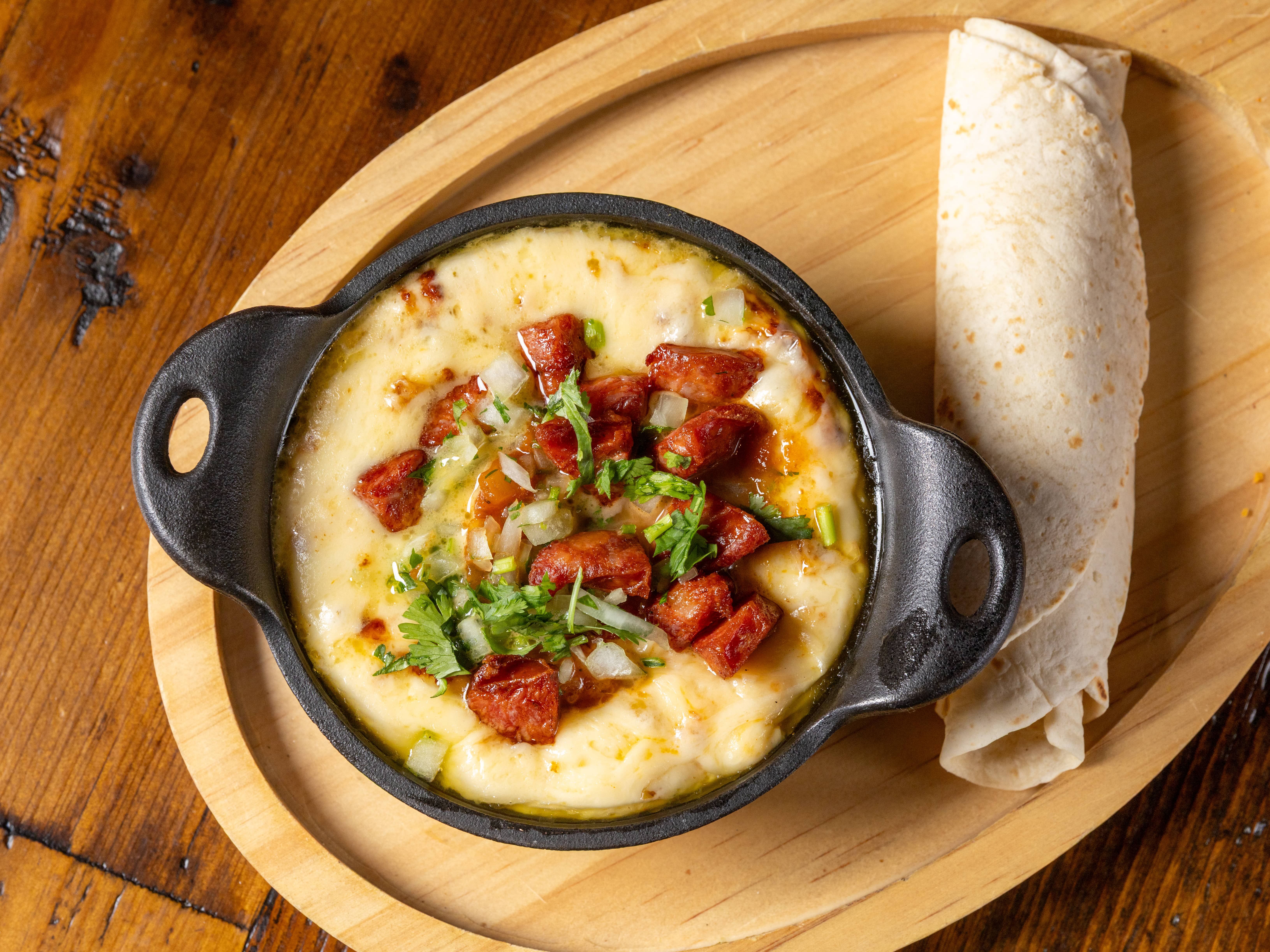 Melted chihuahua cheese, topped with chorizo, cilantro and onions, served with a side of flour tortillas.