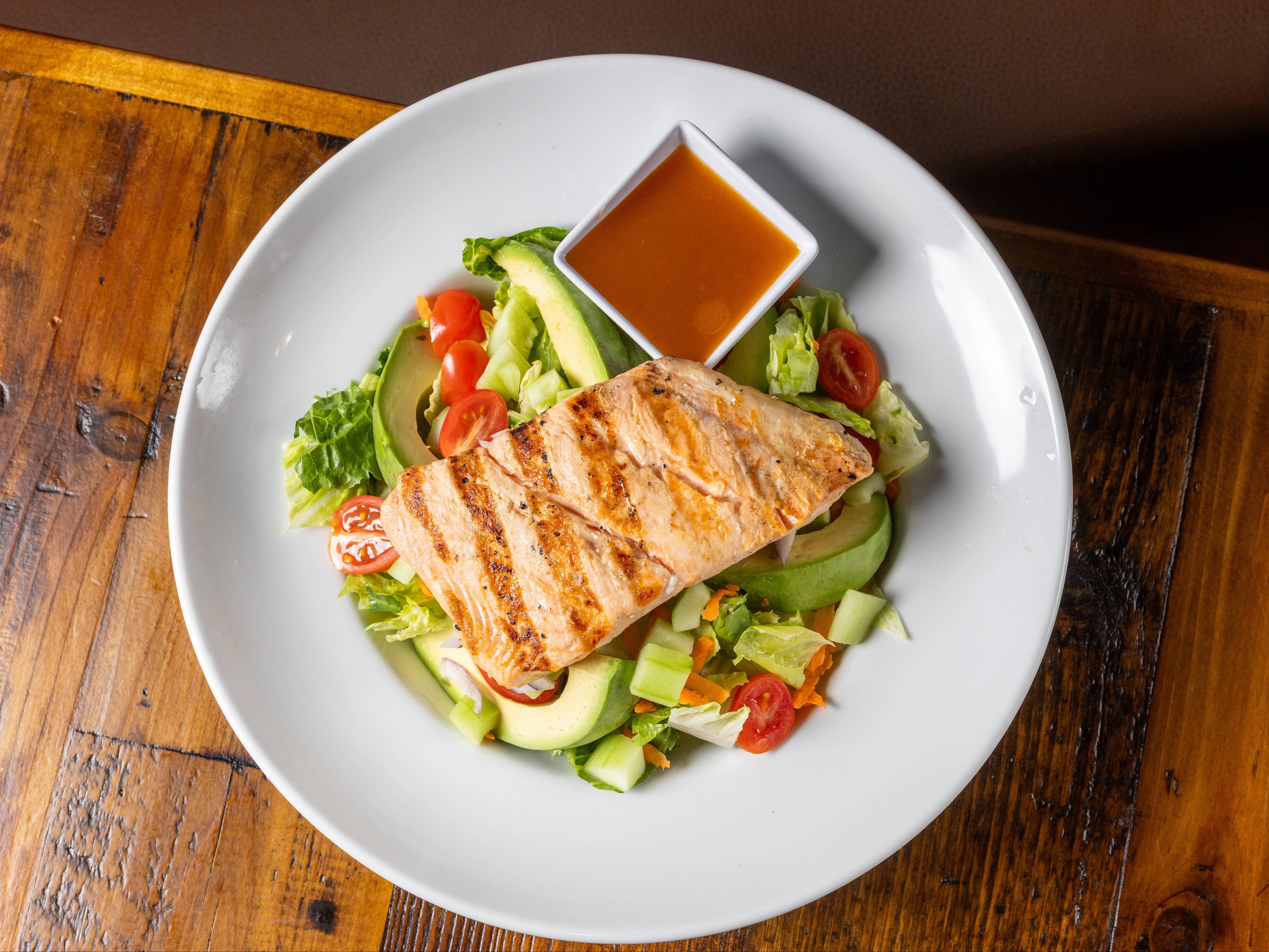 Grilled Salmon over mixed lettuce, cucumbers, cherry tomatoes, carrots and orange shallot vinaigrette on the side