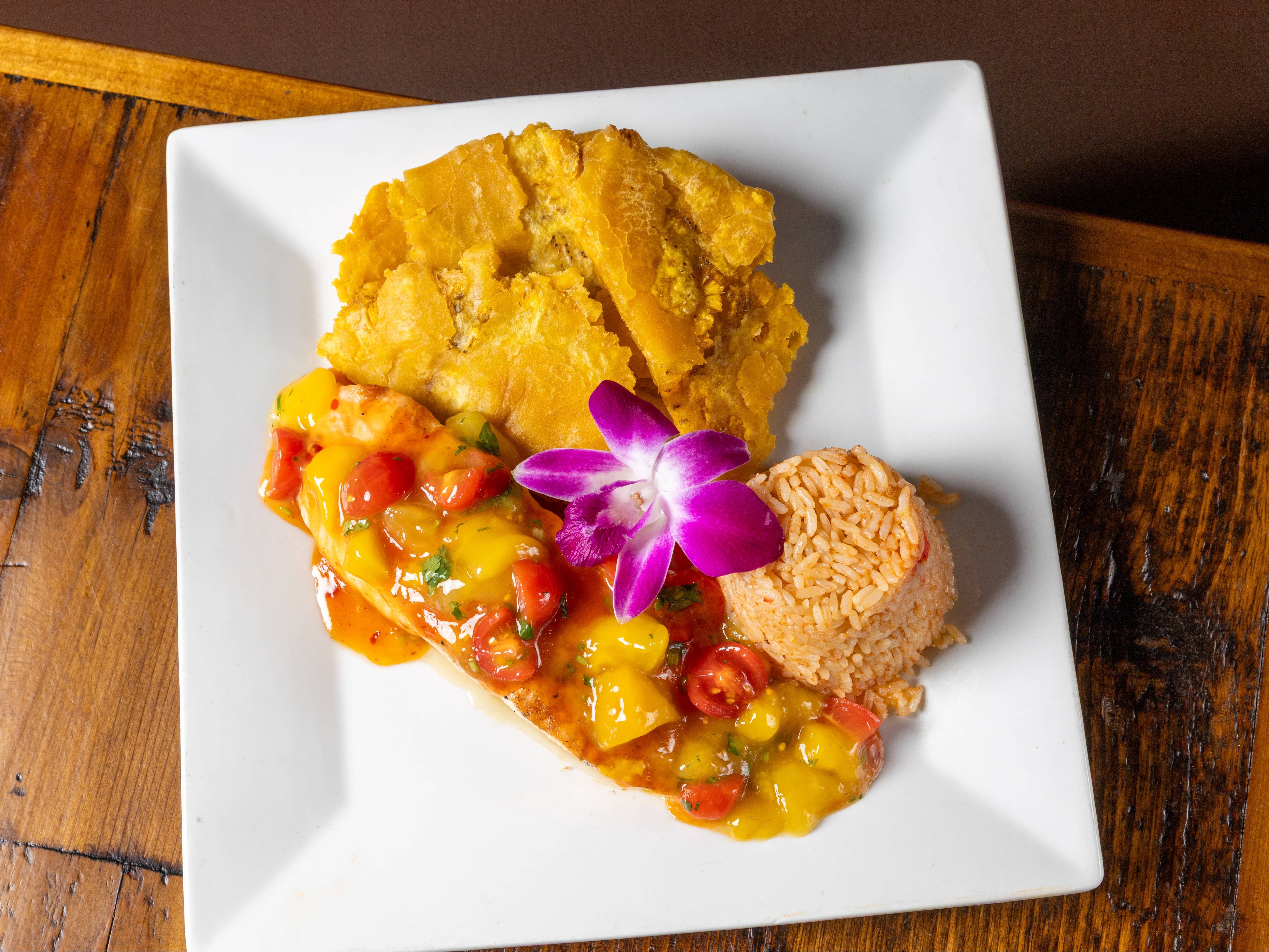Perfectly grilled Salmon glazed with a tangy mango salsa and Pico de Gallo served with Mexican rice and tostones.