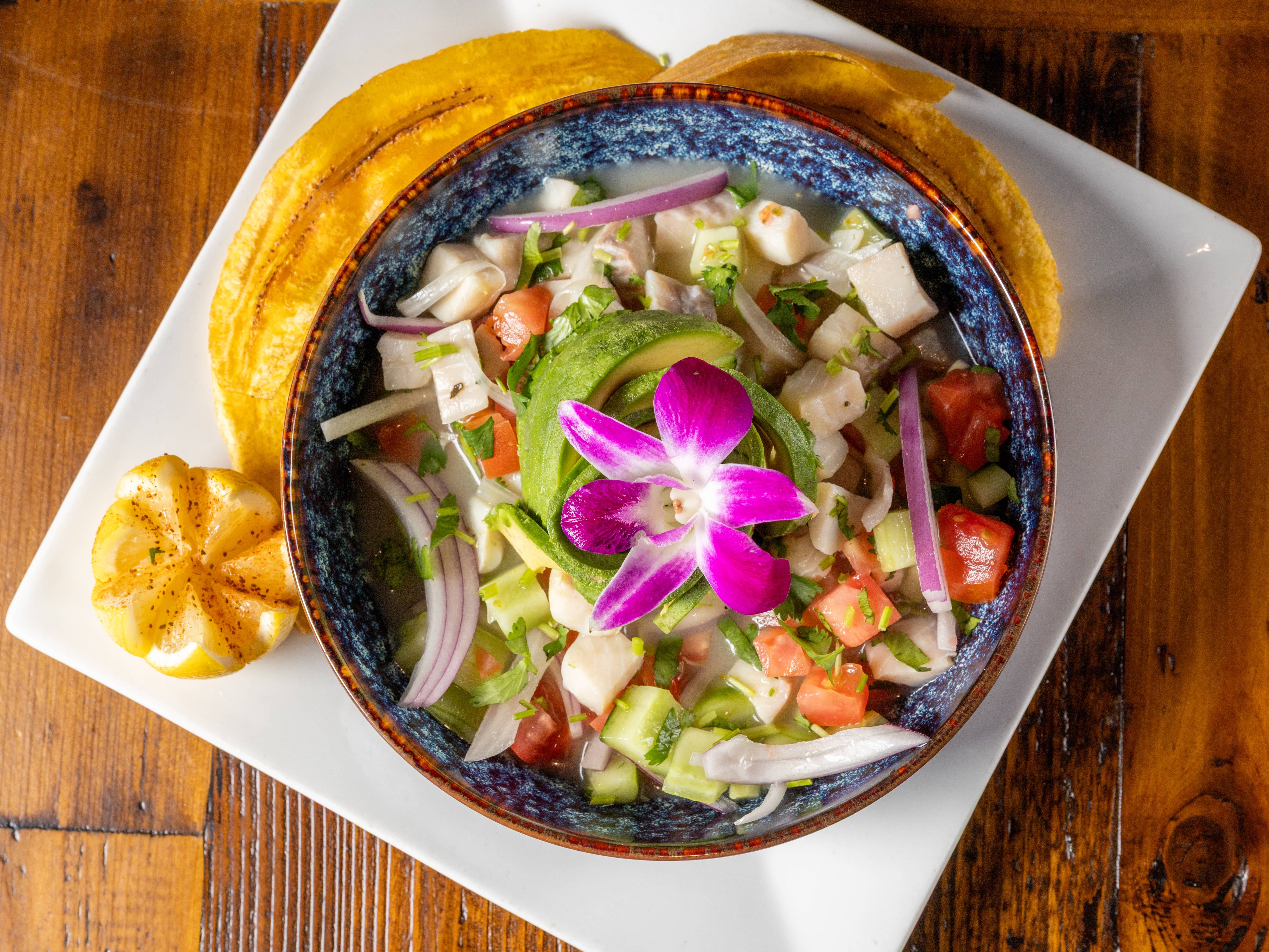 White fish or Shrimp cured in lime with cherry tomatoes, onions, cucumbers, and avocado